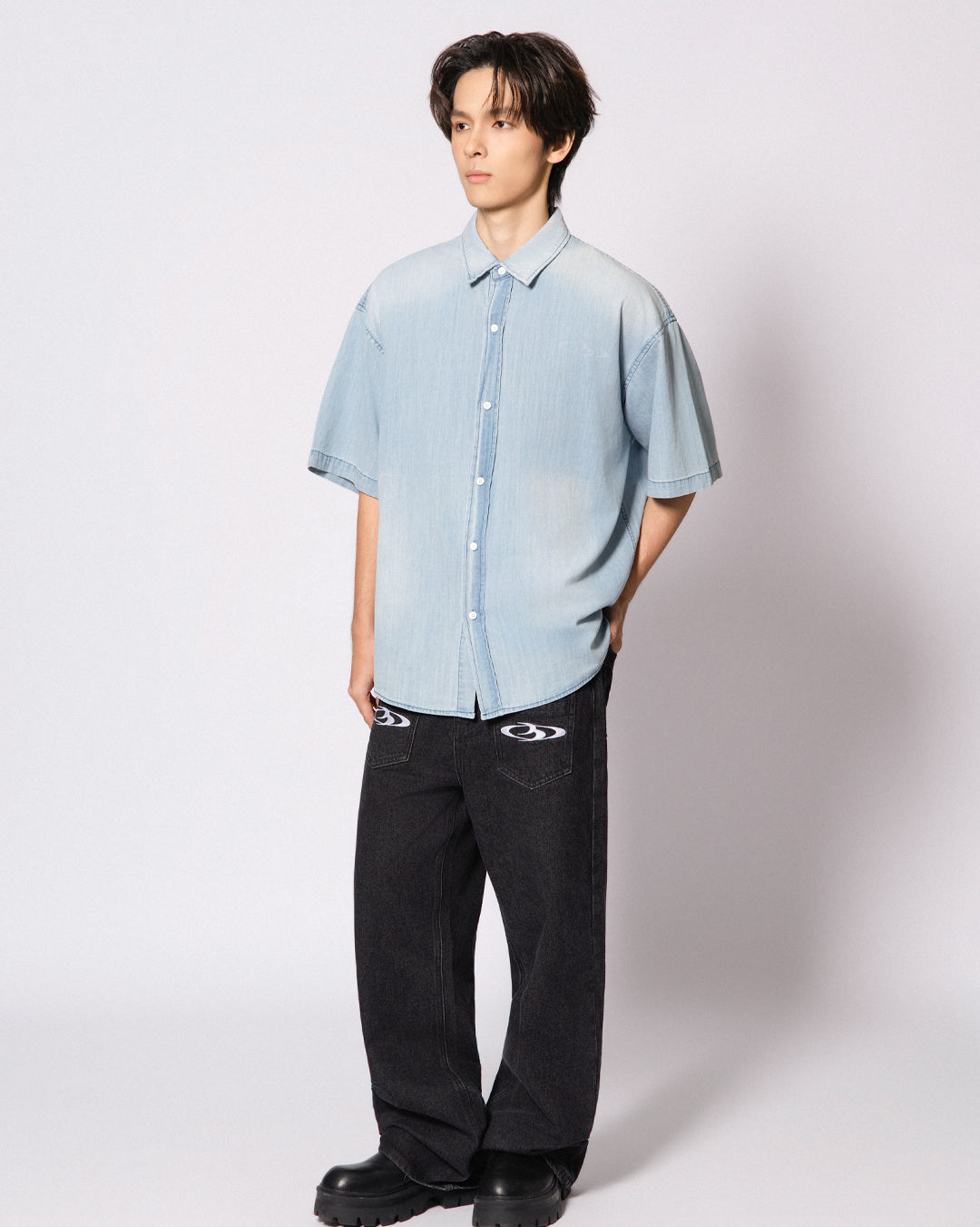 Crafted from lightweight denim with a soft washed finish, this piece delivers structure without stiffness. A subtle paint-spray effect hits the front logo and back wording, adding just enough depth and character while staying clean, comfy, and effortlessly understated. Dropped shoulders enhance the laid-back streetwear vibe, making it easy to style open or buttoned up.