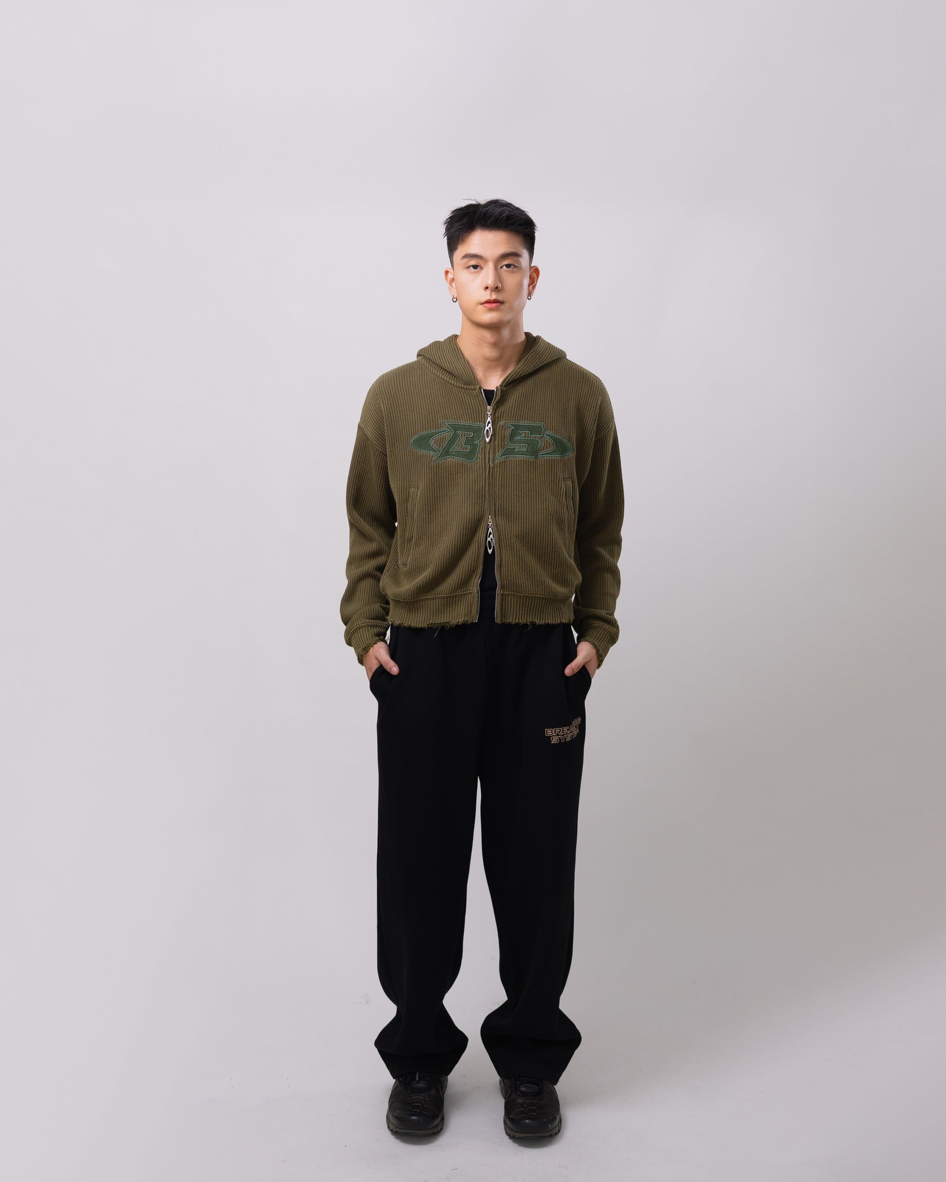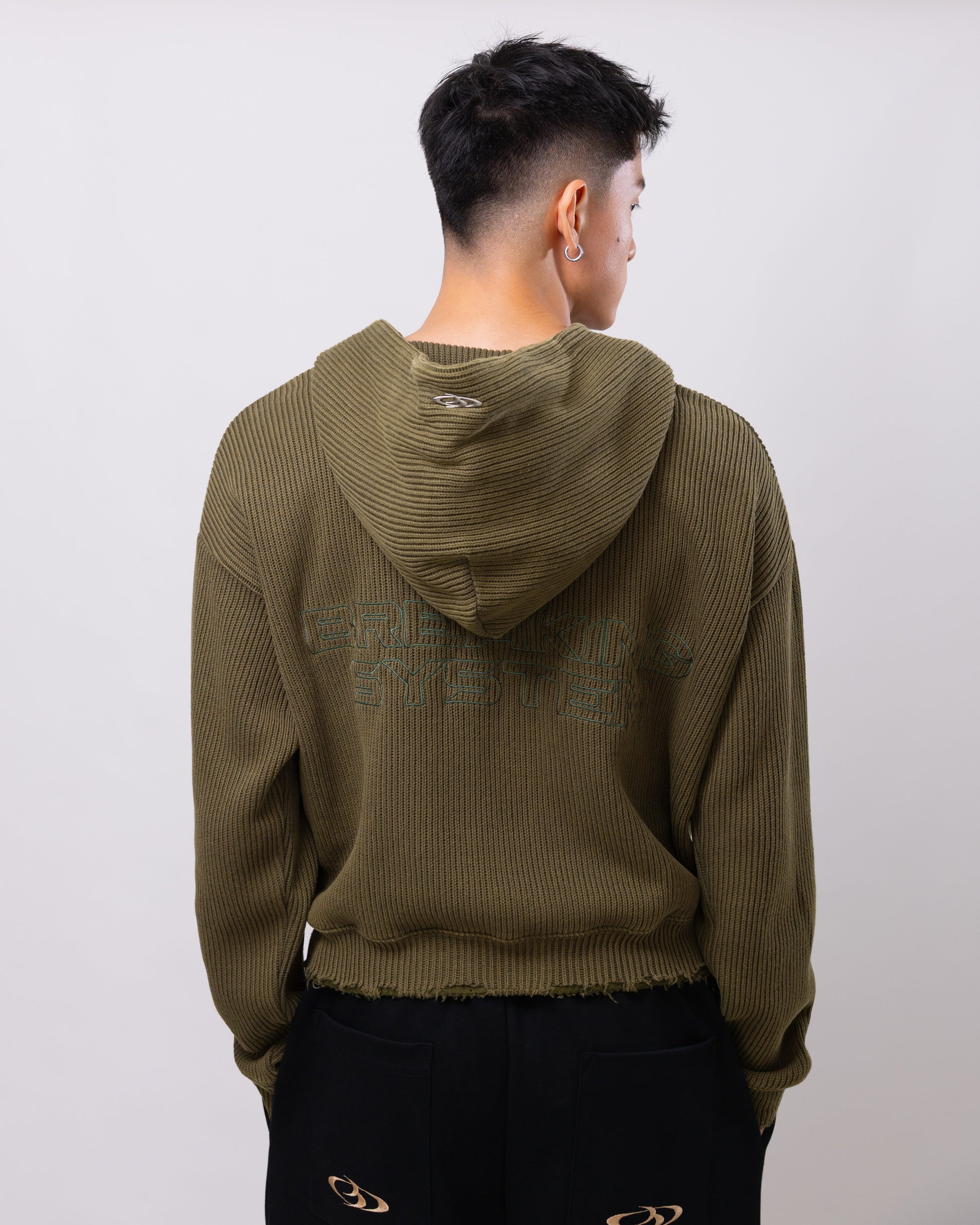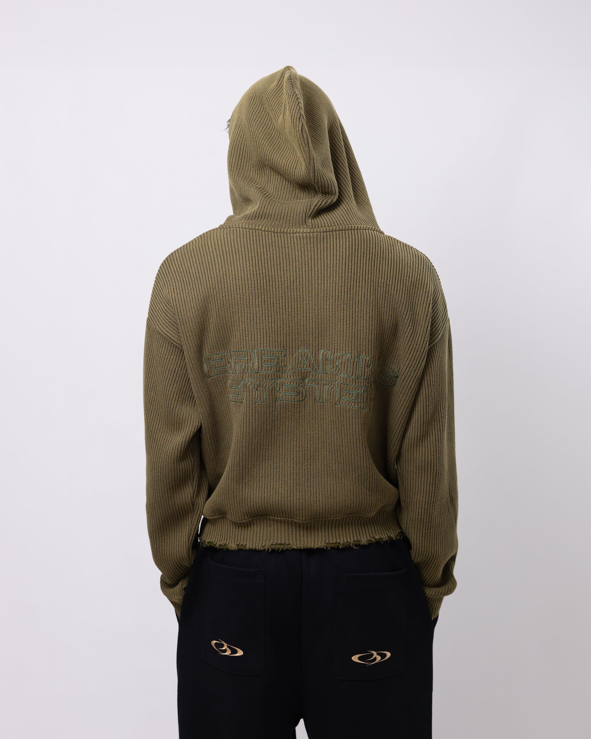 A streetwear essential with a bold edge. The Navy Green Distressed Zip-Up Hoodie is made from premium waffle-textured cotton for a soft yet structured feel. It features an oversized “BS” logo on the chest and “BREAKING SYSTEM” embroidery across the back. The cropped fit, raw-edge hem, and custom zipper pull add a distinctive, worn-in look.